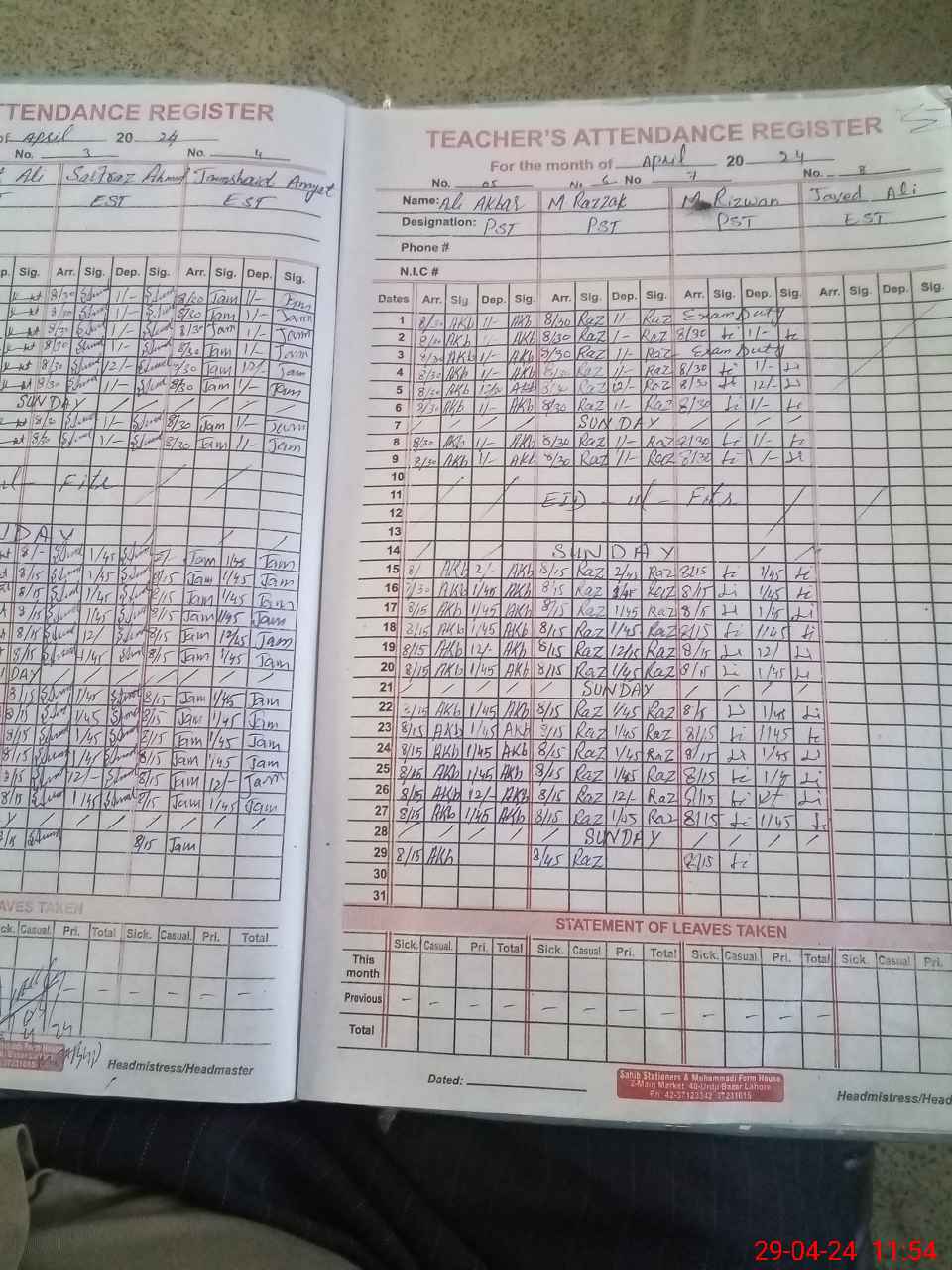 | CNIC | Full Name | Designation | R/C | Absence During Last Calender Month |
