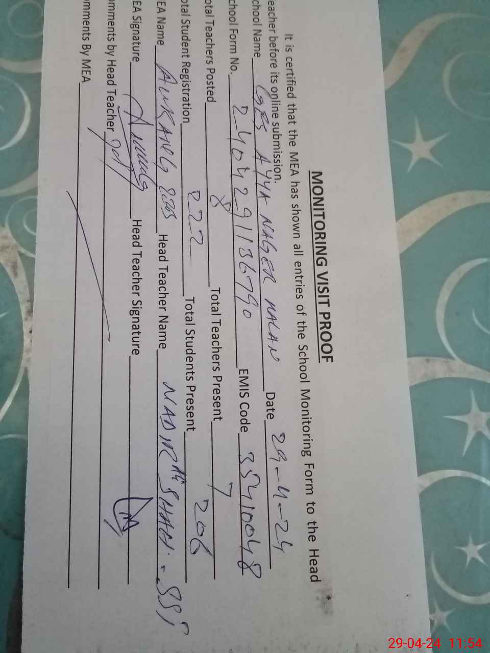 | Attendance Register | Head Teacher | MEA with School | Visit Proof |
