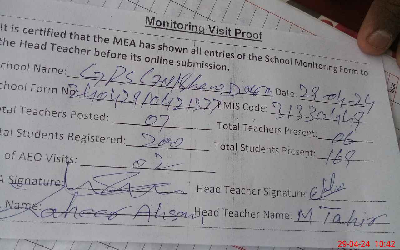 | Attendance Register | Head Teacher | MEA with School | Visit Proof |