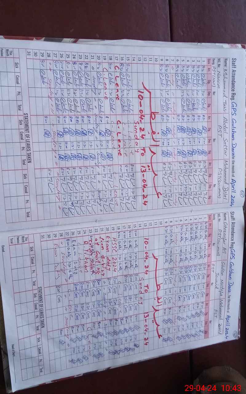| CNIC | Full Name | Designation | R/C | Absence During Last Calender Month |