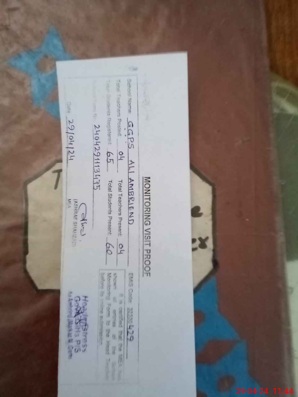 | Attendance Register | Head Teacher | MEA with School | Visit Proof |