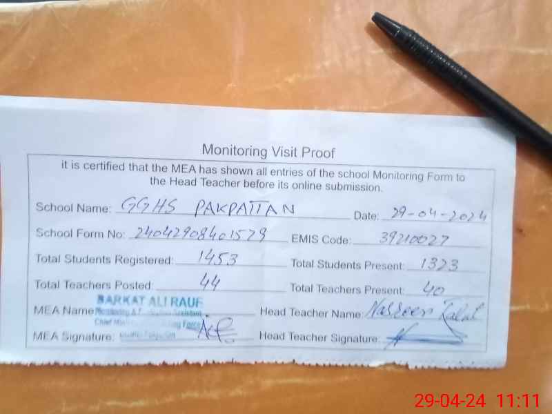 | EMIS Code: 39210027 | Name of School: GGHS PAKPATTAN | |||