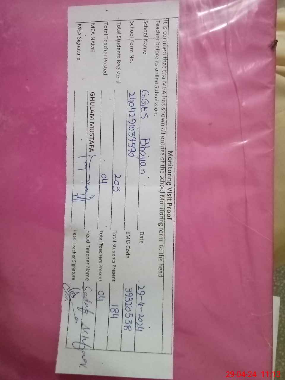 | Attendance Register | Head Teacher | MEA with School | Visit Proof |