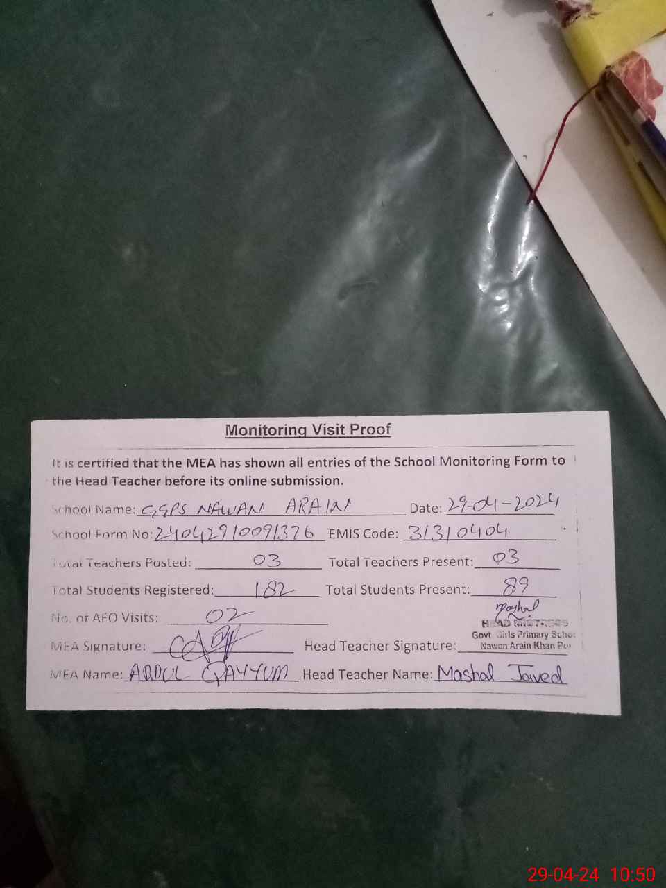 | Attendance Register | Head Teacher | MEA with School | Visit Proof |