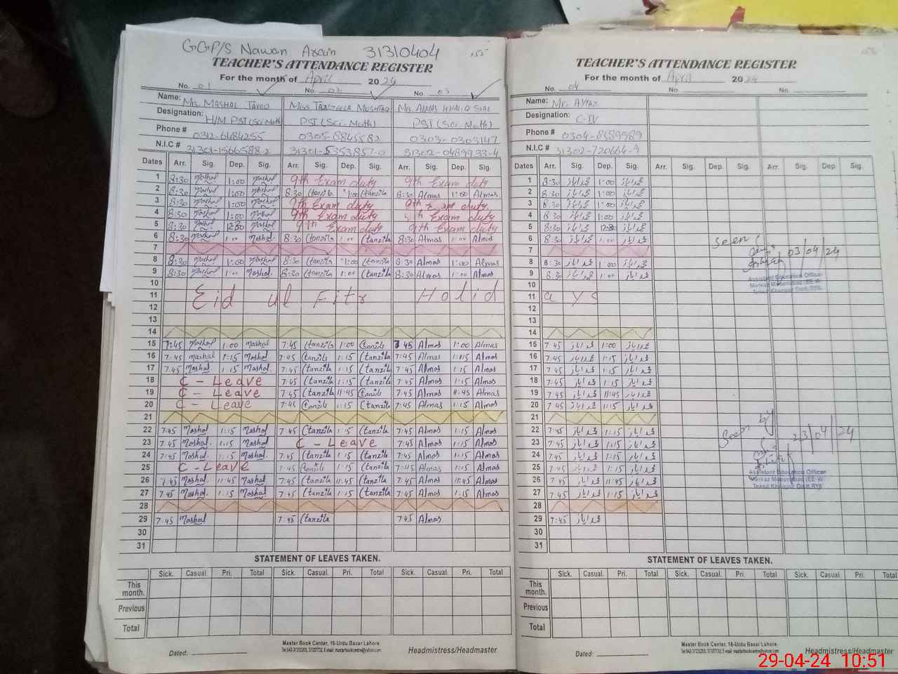 | CNIC | Full Name | Designation | R/C | Absence During Last Calender Month |