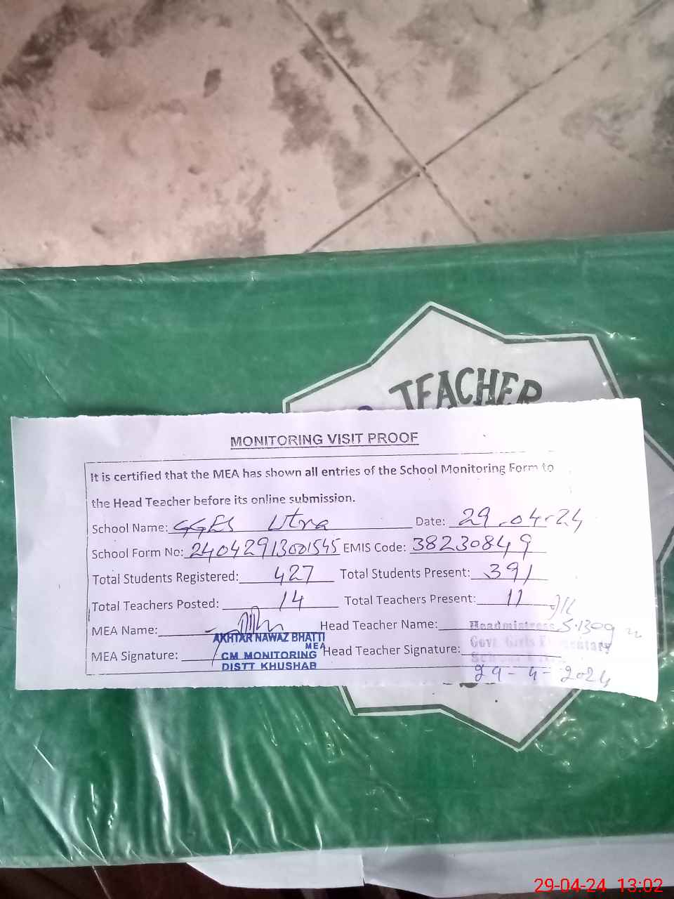 | Attendance Register | Head Teacher | MEA with School | Visit Proof |
