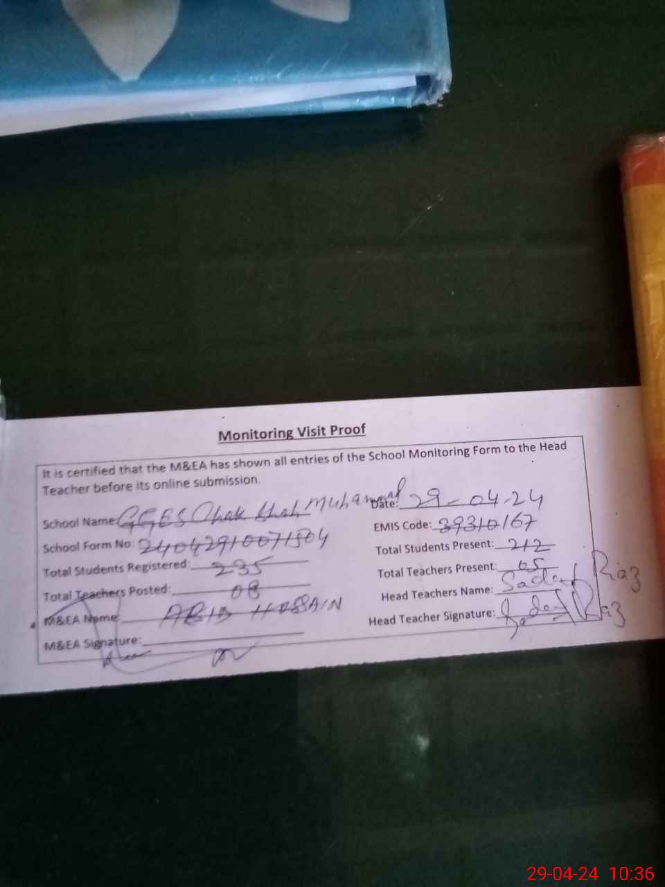 | Attendance Register | Head Teacher | MEA with School | Visit Proof |