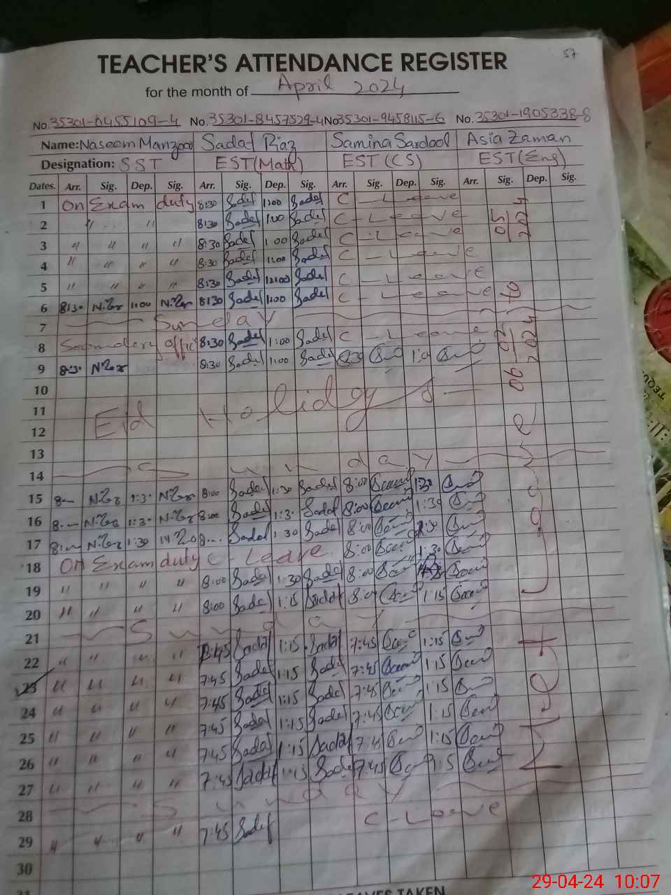 | CNIC | Full Name | Designation | R/C | Absence During Last Calender Month |