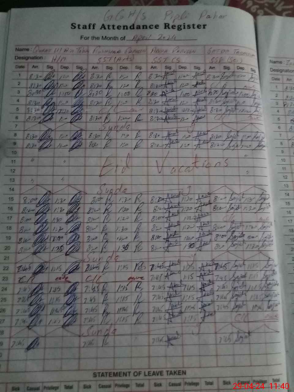 | CNIC | Full Name | Designation | R/C | Absence During Last Calender Month |
