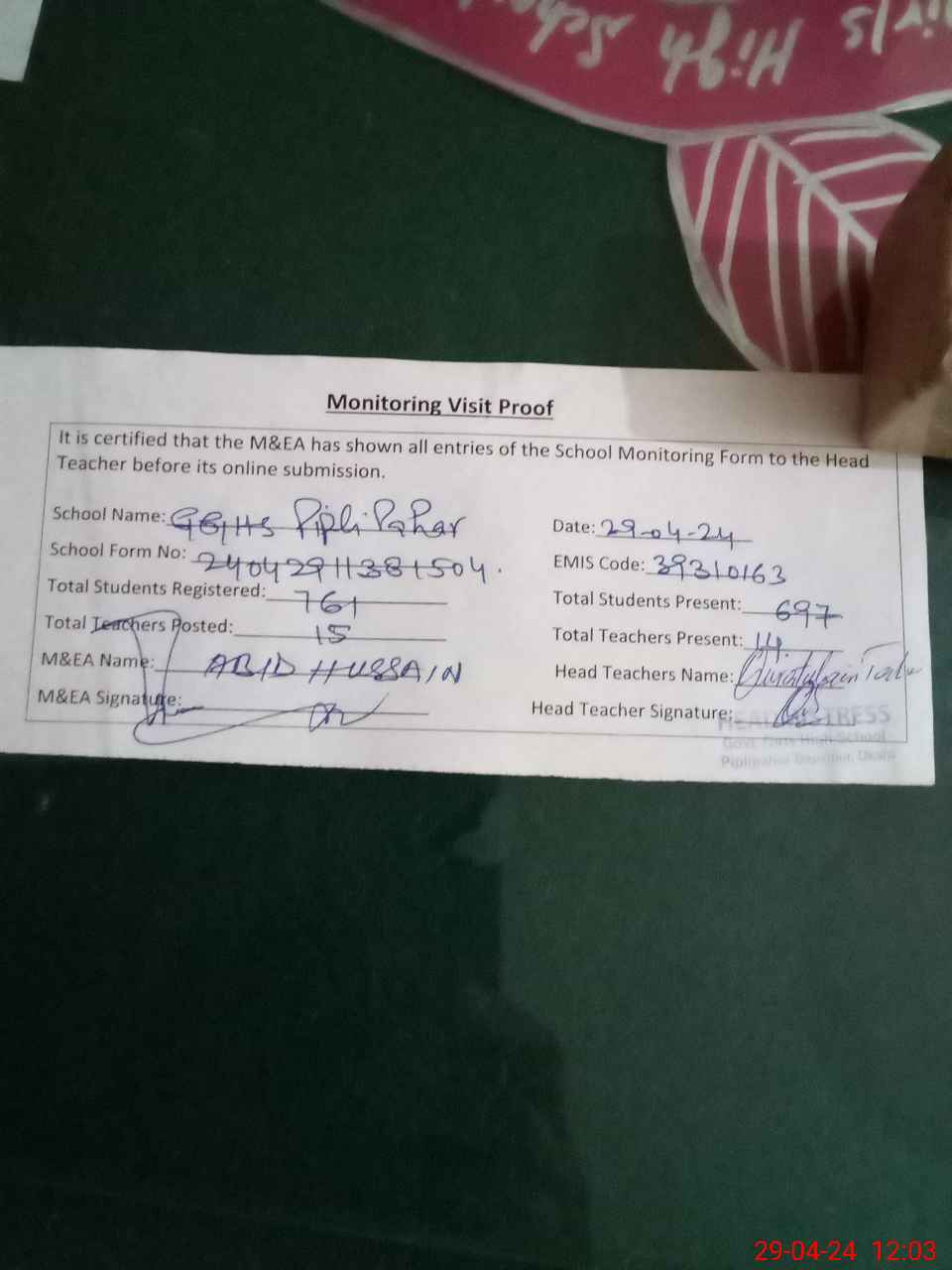 | Attendance Register | Head Teacher | MEA with School | Visit Proof |