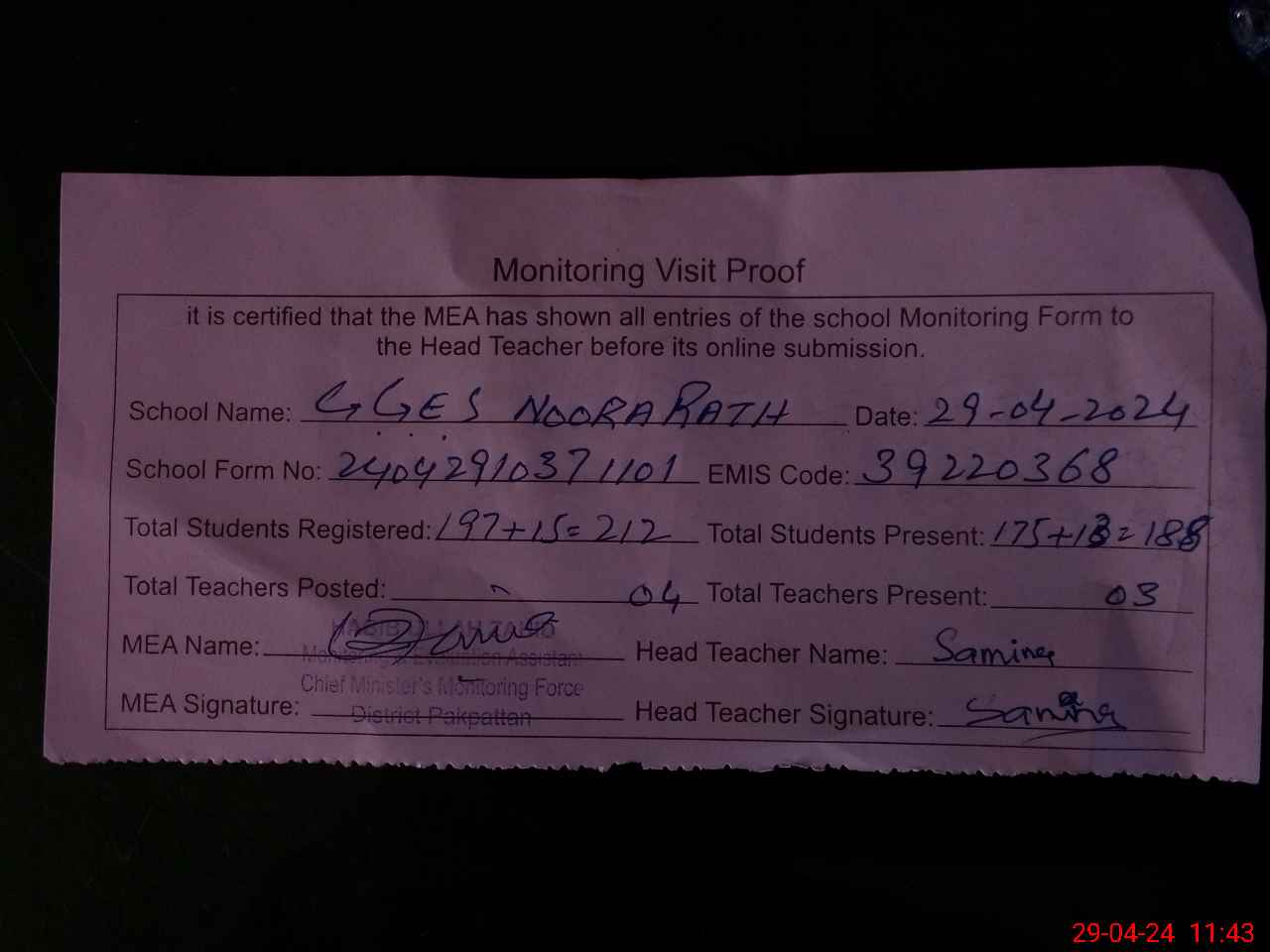 | Attendance Register | Head Teacher | MEA with School | Visit Proof |