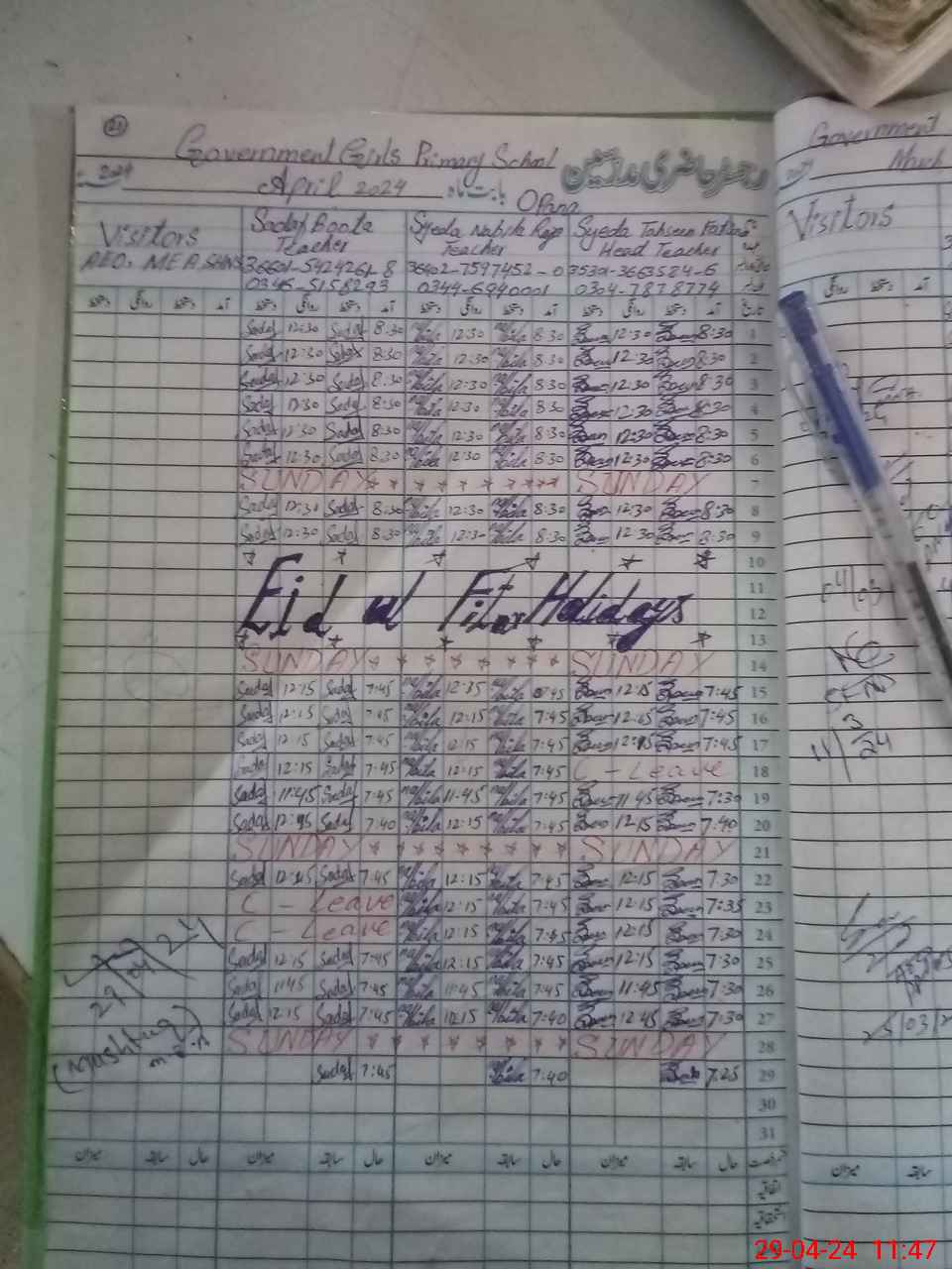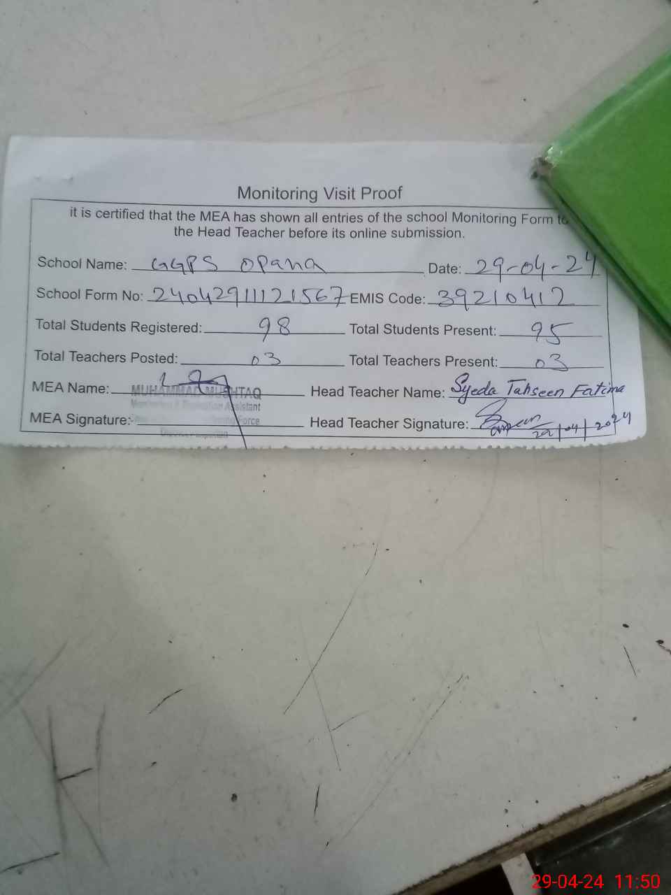| Attendance Register | Head Teacher | MEA with School | Visit Proof |
