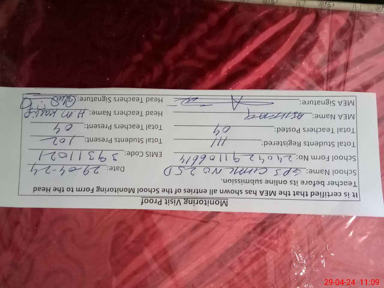 | Attendance Register | Head Teacher | MEA with School | Visit Proof |