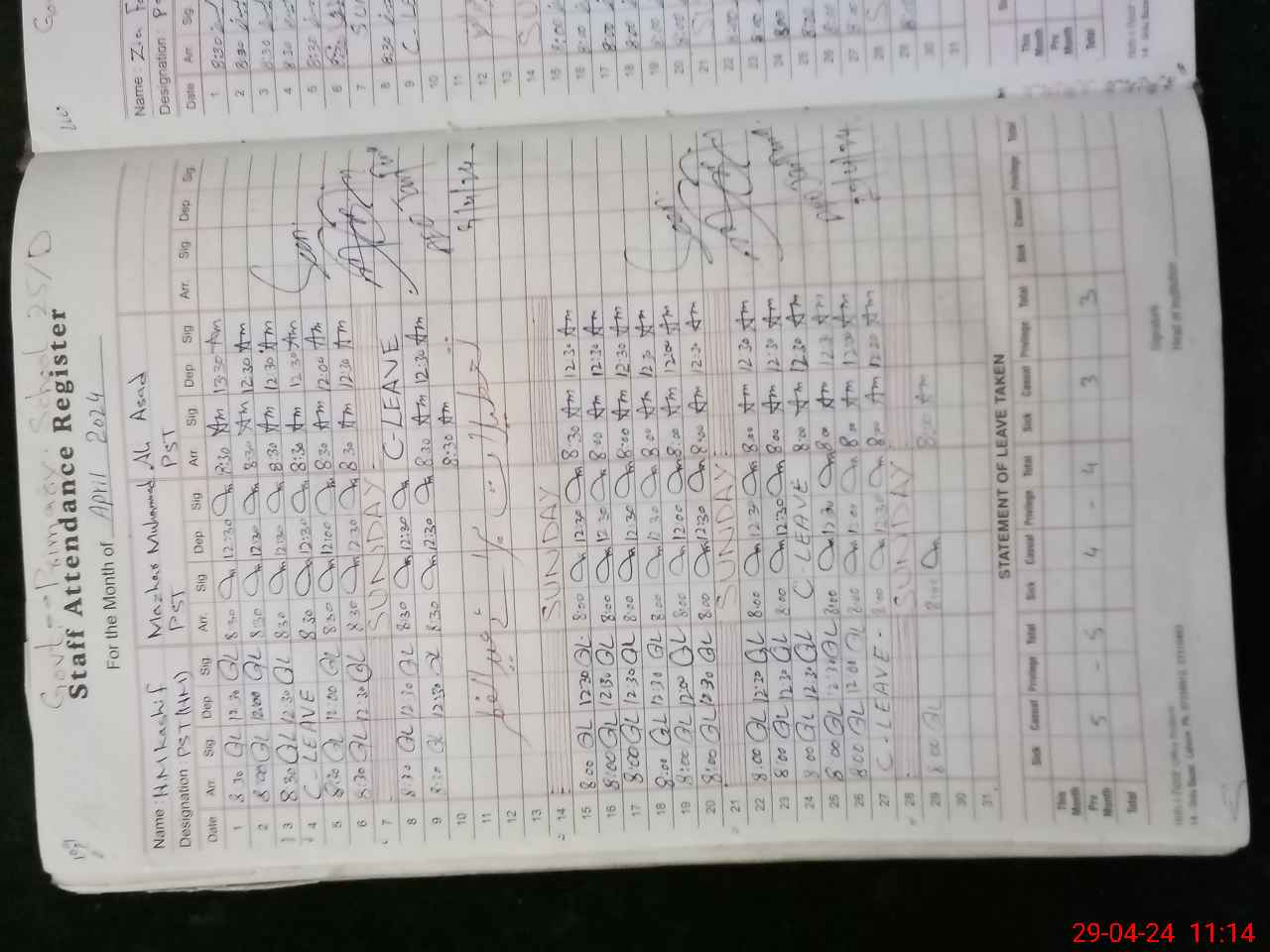 | CNIC | Full Name | Designation | R/C | Absence During Last Calender Month |