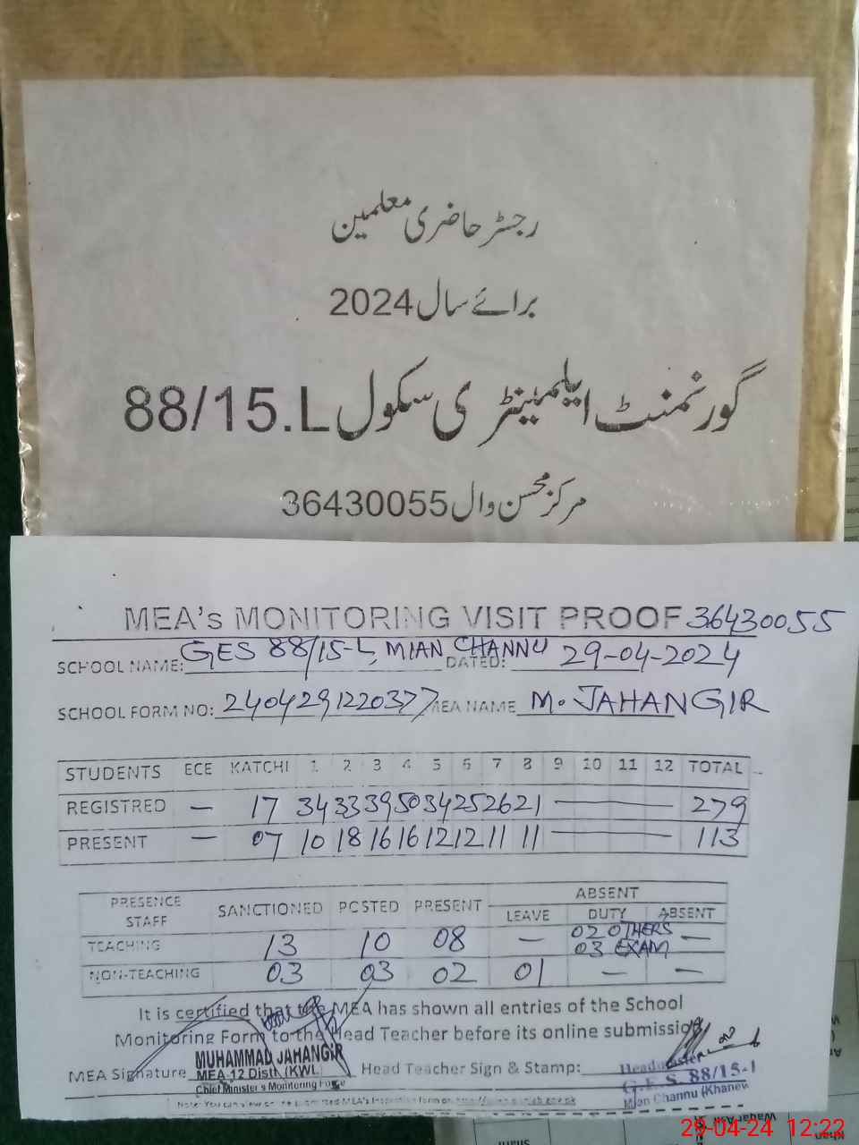 | Attendance Register | Head Teacher | MEA with School | Visit Proof |
