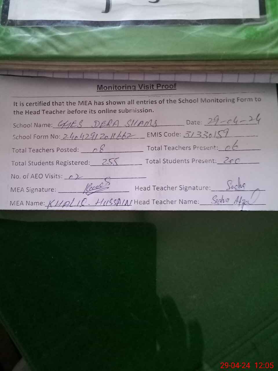 | Attendance Register | Head Teacher | MEA with School | Visit Proof |