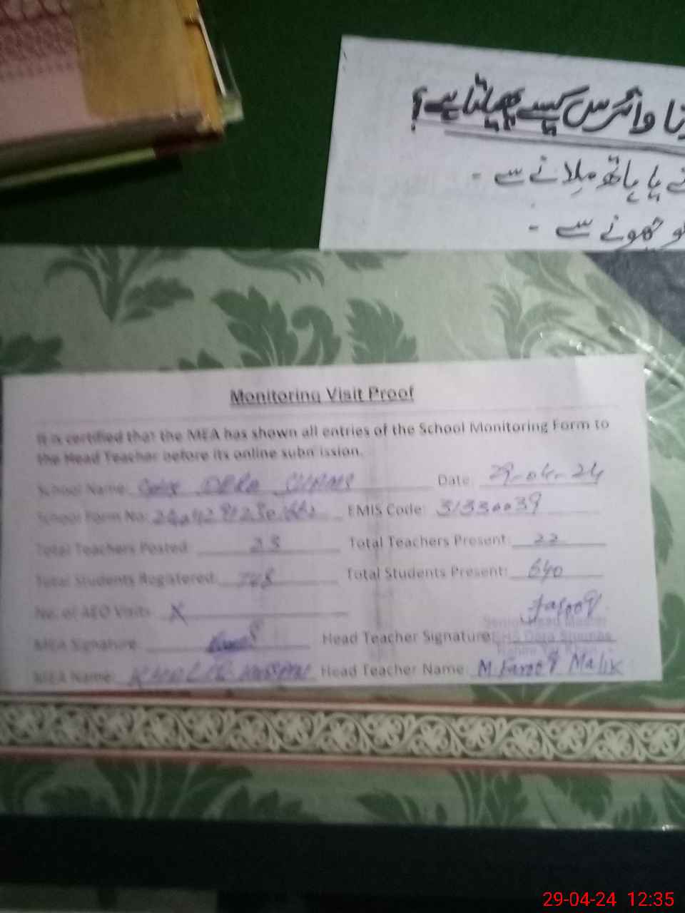 | Certified that this School was Inspected by the Undersigned MEA/DMO Today and the Information Stated Above is as Per Record. | |||||