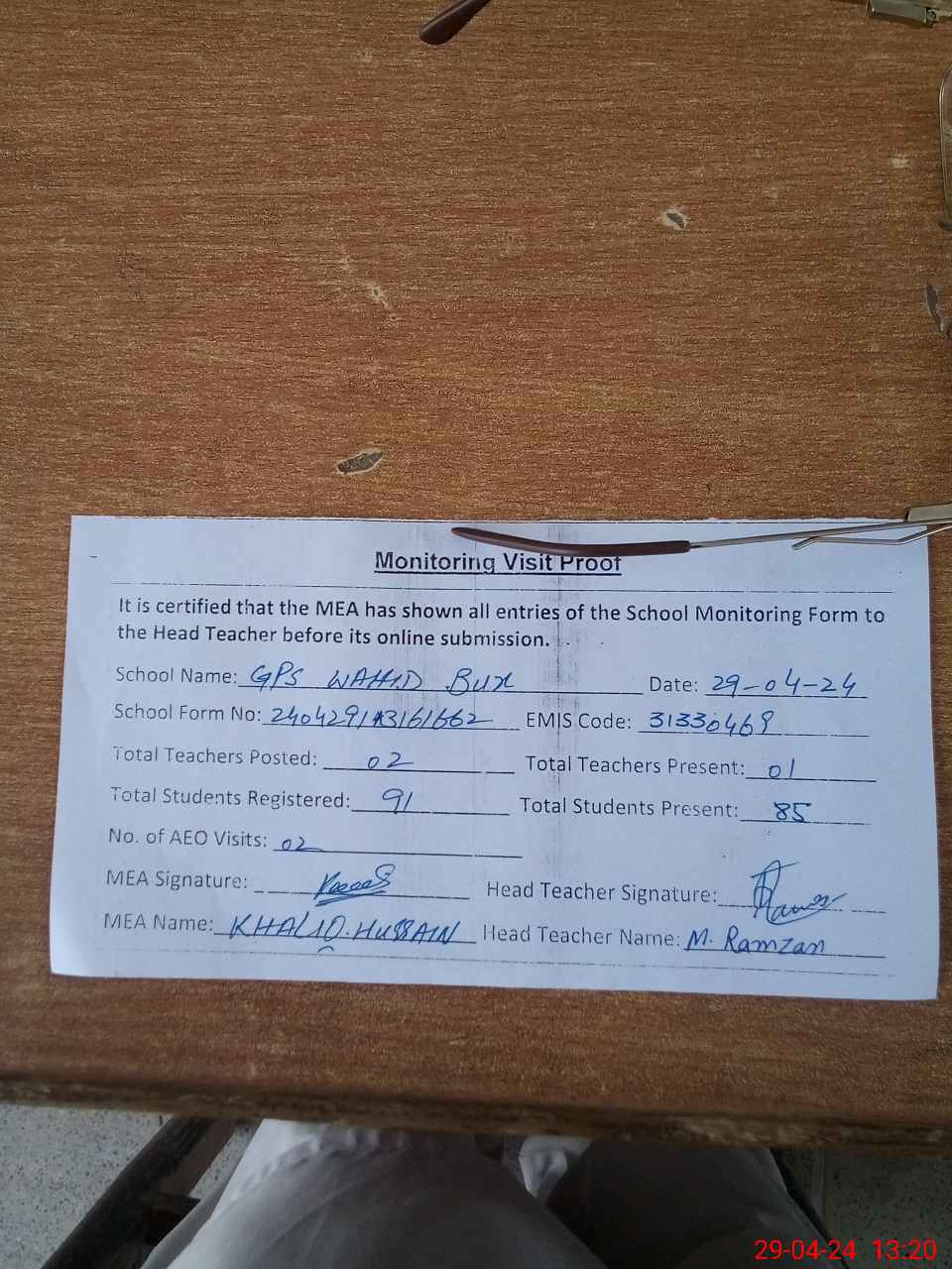 | EMIS Code: 31330469 | Name of School: GPS WAHID BUX | |||