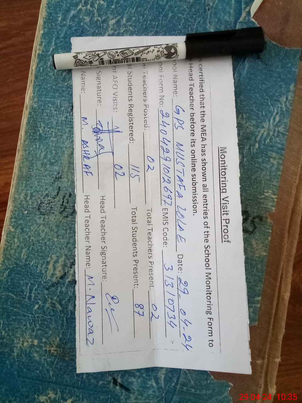 | Attendance Register | Head Teacher | MEA with School | Visit Proof |