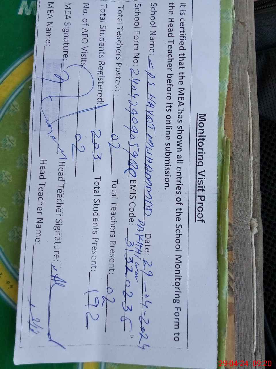 | Attendance Register | Head Teacher | MEA with School | Visit Proof |