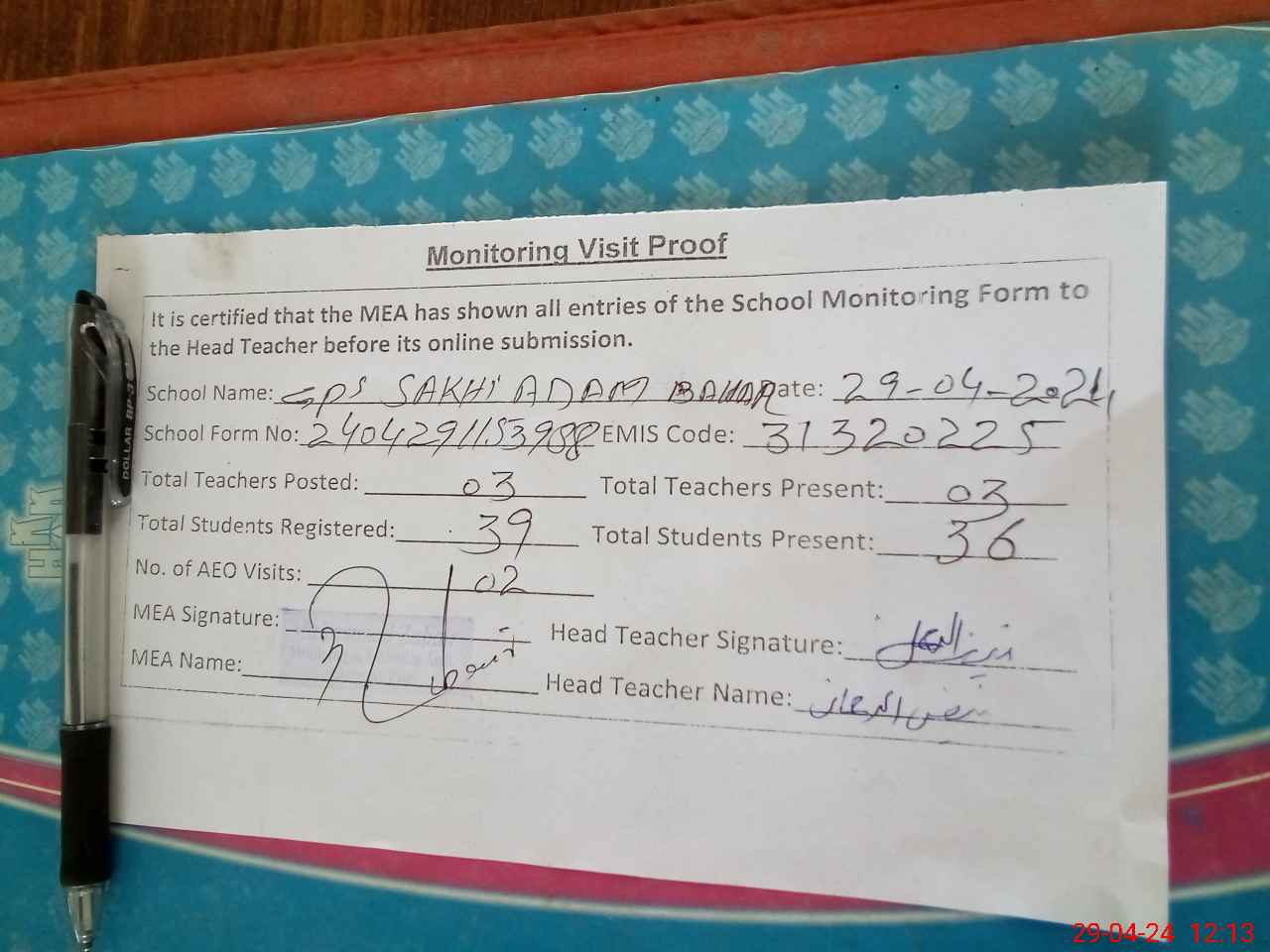 | Attendance Register | Head Teacher | MEA with School | Visit Proof |