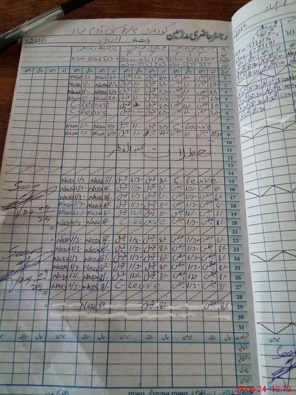 | CNIC | Full Name | Designation | R/C | Absence During Last Calender Month |