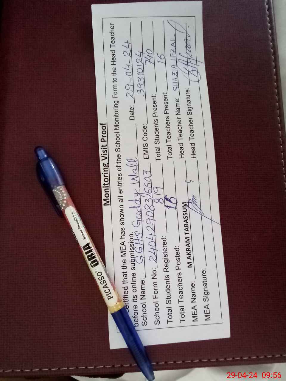 | Attendance Register | Head Teacher | MEA with School | Visit Proof |