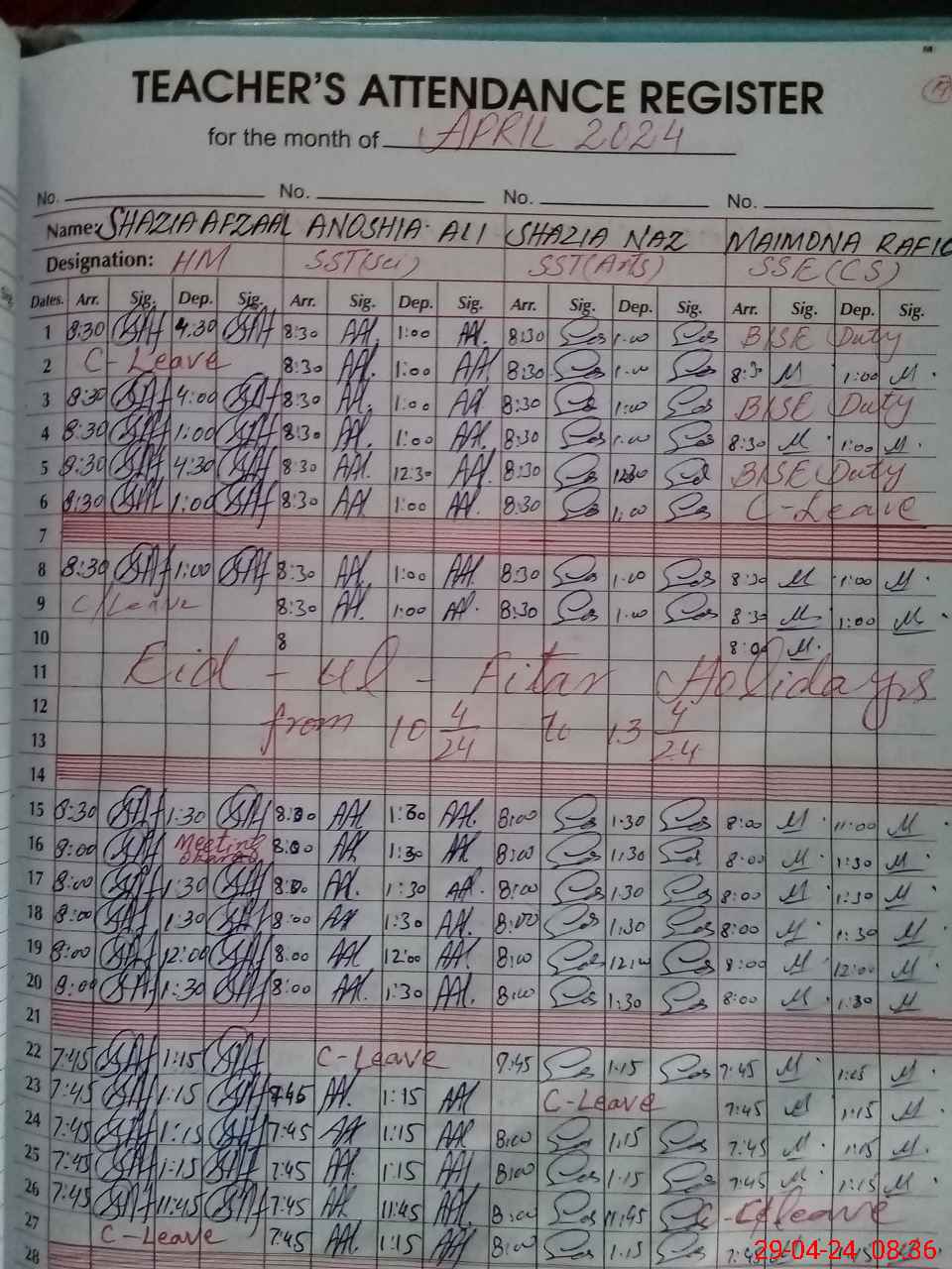 | CNIC | Full Name | Designation | R/C | Absence During Last Calender Month |