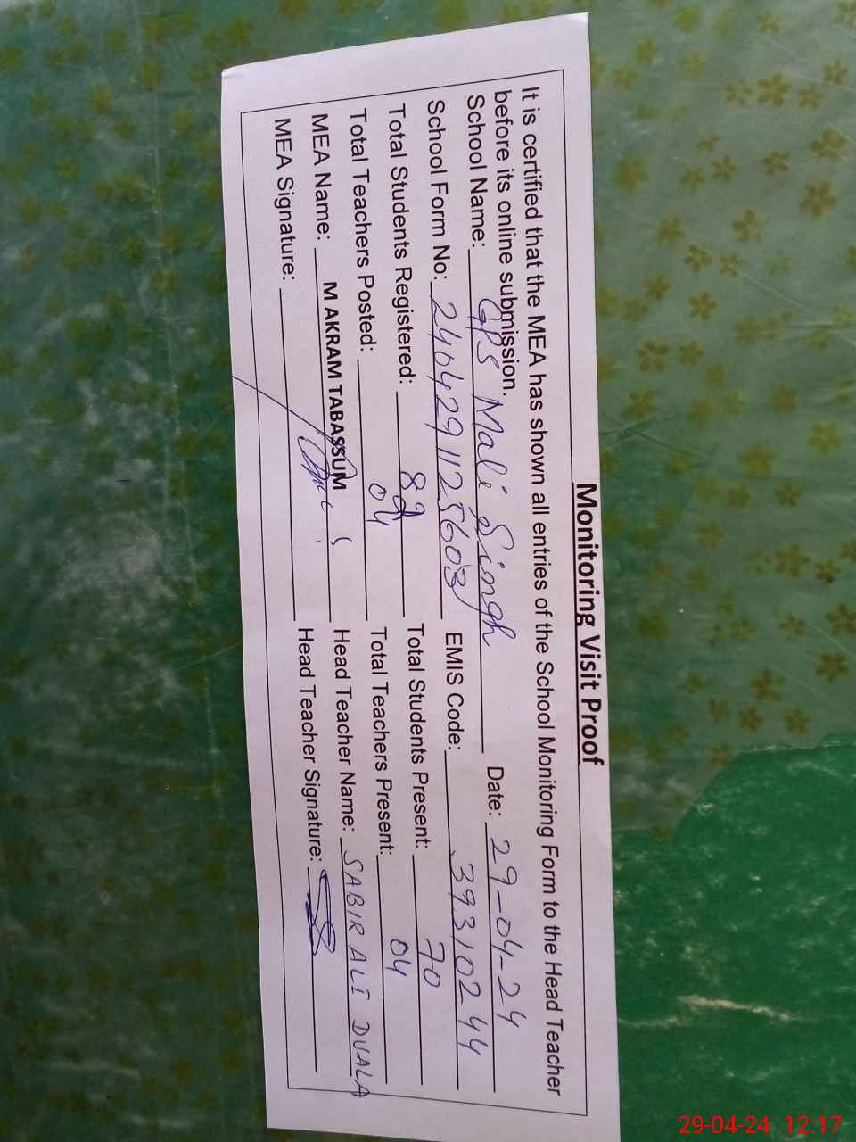 | EMIS Code: 39310244 | Name of School: GPS MALI SINGH | |||