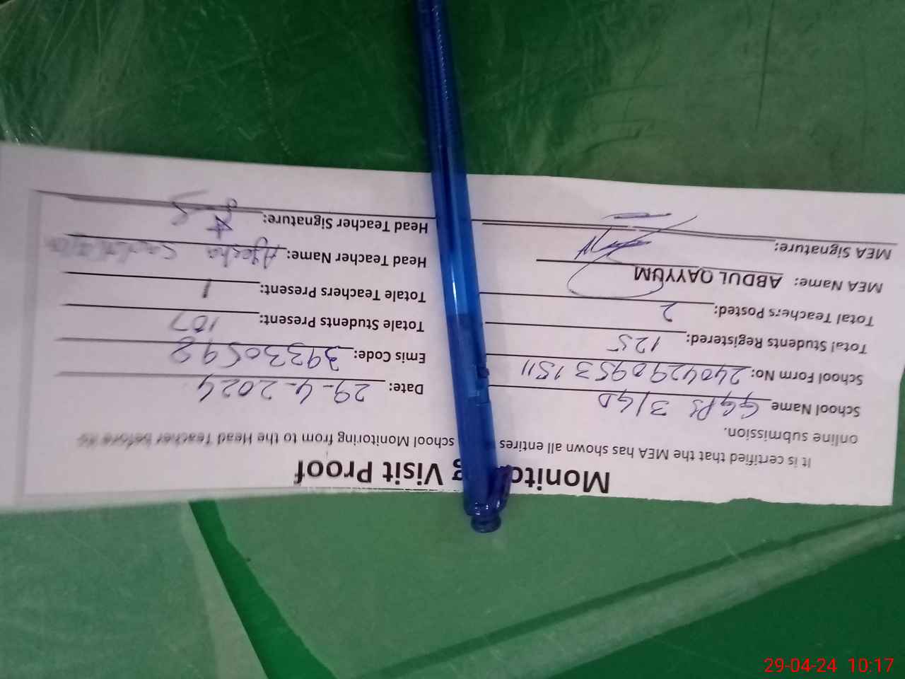 | Attendance Register | Head Teacher | MEA with School | Visit Proof |