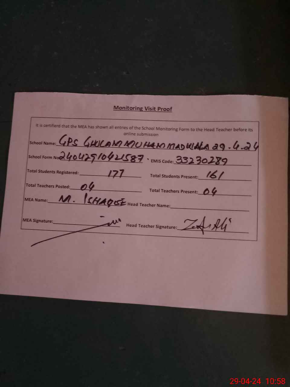 | Attendance Register | Head Teacher | MEA with School | Visit Proof |