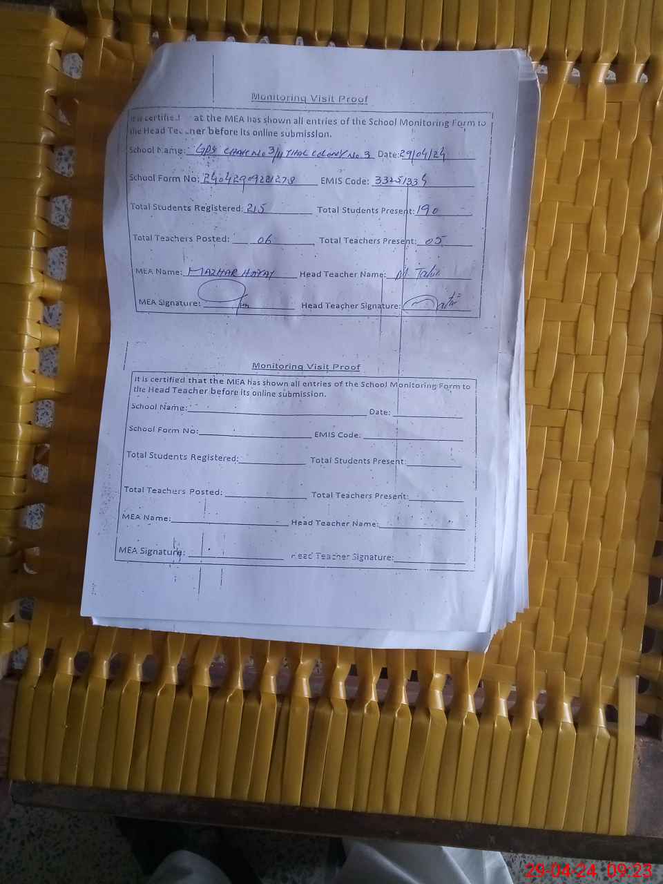 | Attendance Register | Head Teacher | MEA with School | Visit Proof |