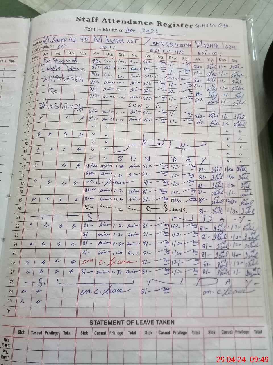 | Remarks (Use Separate Page if Required): 01 Teacher named Muhammad Amin SST temporarily attached from AEO Office Renala khurd on casual leave | |||||