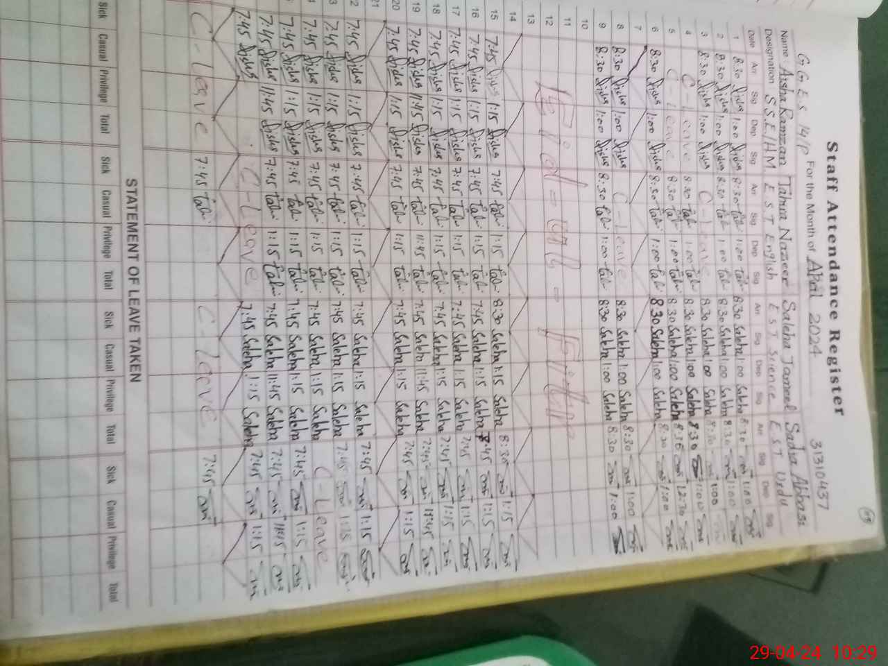 | CNIC | Full Name | Designation | R/C | Absence During Last Calender Month |