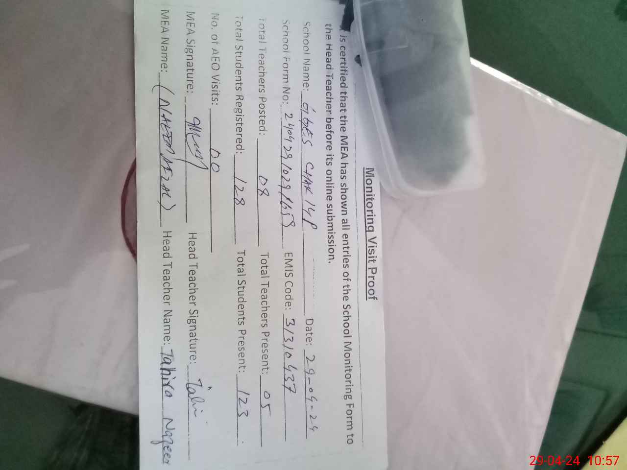 | Attendance Register | Head Teacher | MEA with School | Visit Proof |