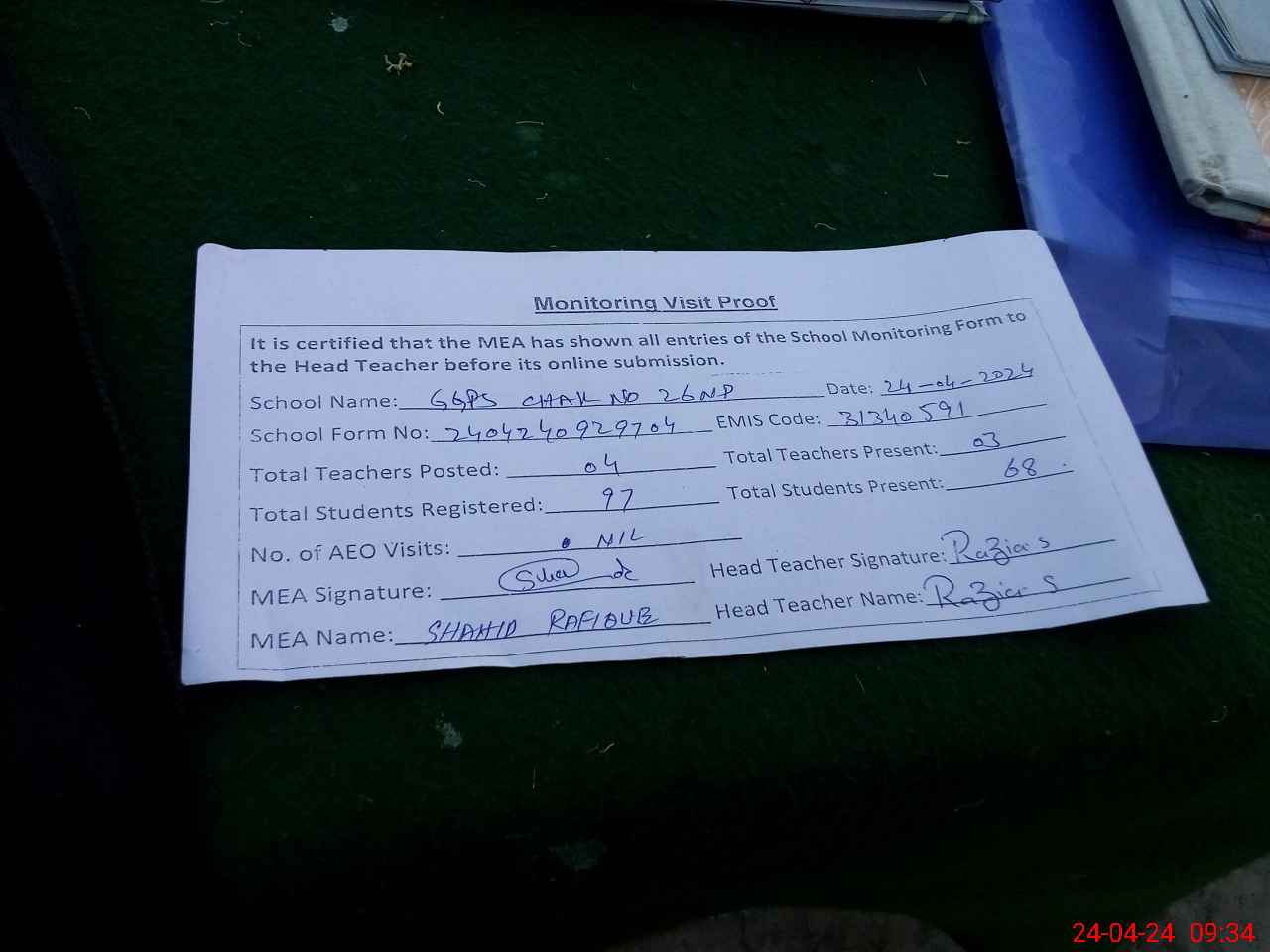 | Attendance Register | Head Teacher | MEA with School | Visit Proof |