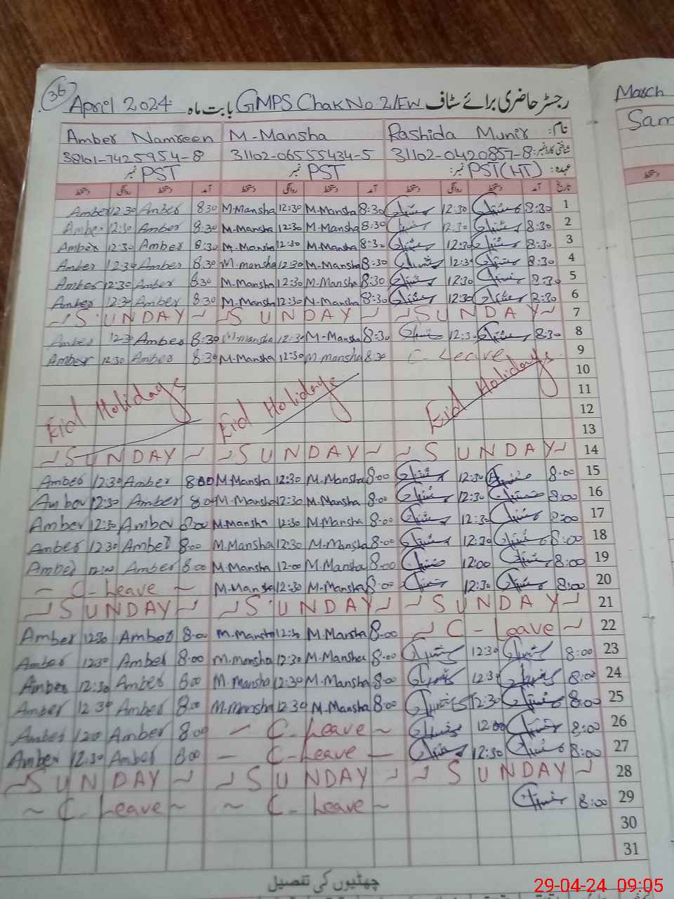 | CNIC | Full Name | Designation | R/C | Absence During Last Calender Month |