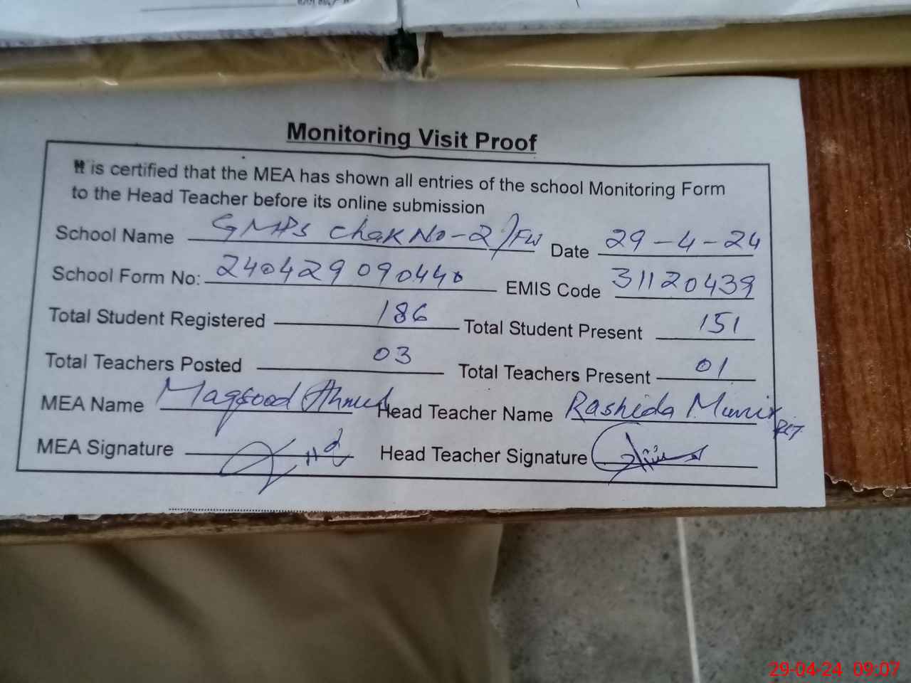 | EMIS Code: 31120439 | Name of School: GMPS CHAK NO. 2/FW | |||