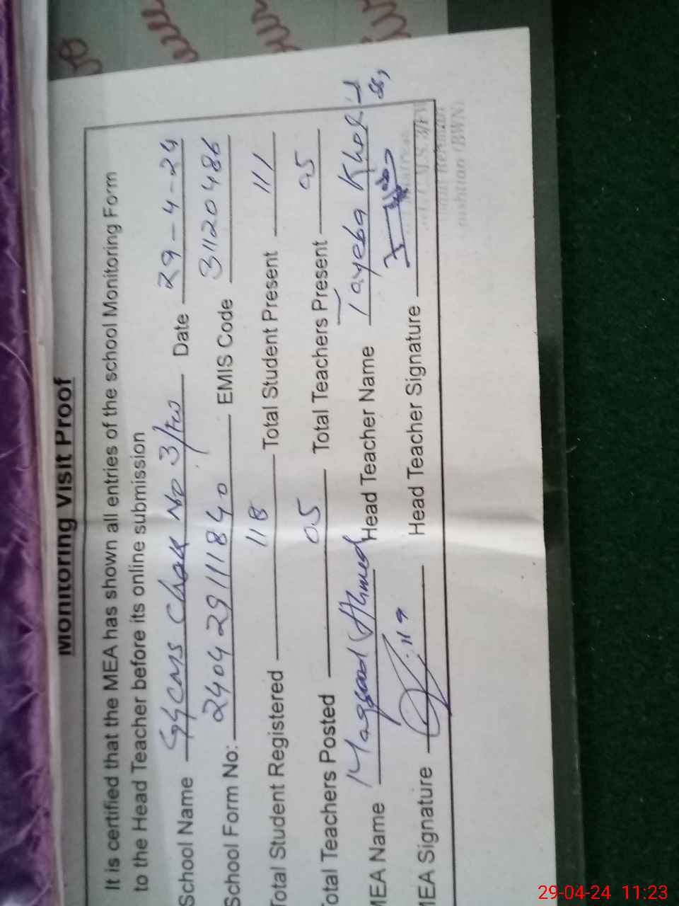 | Attendance Register | Head Teacher | MEA with School | Visit Proof |