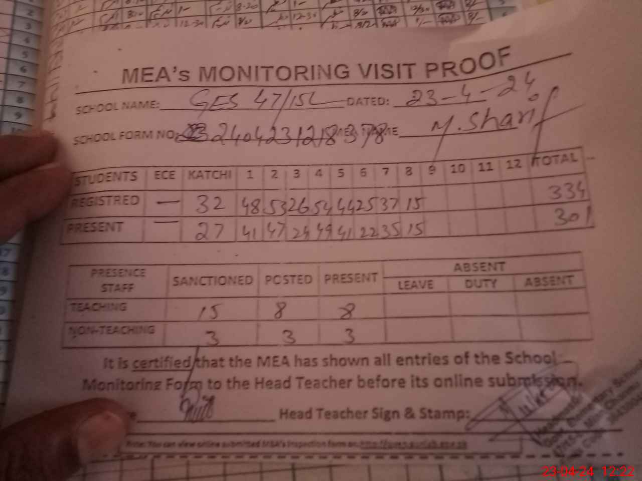 | Attendance Register | Head Teacher | MEA with School | Visit Proof |