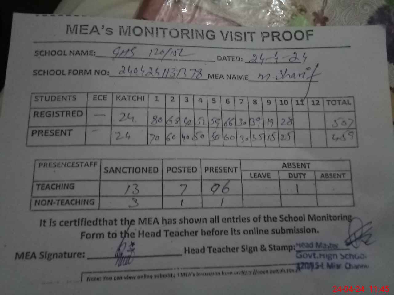 | Attendance Register | Head Teacher | MEA with School | Visit Proof |