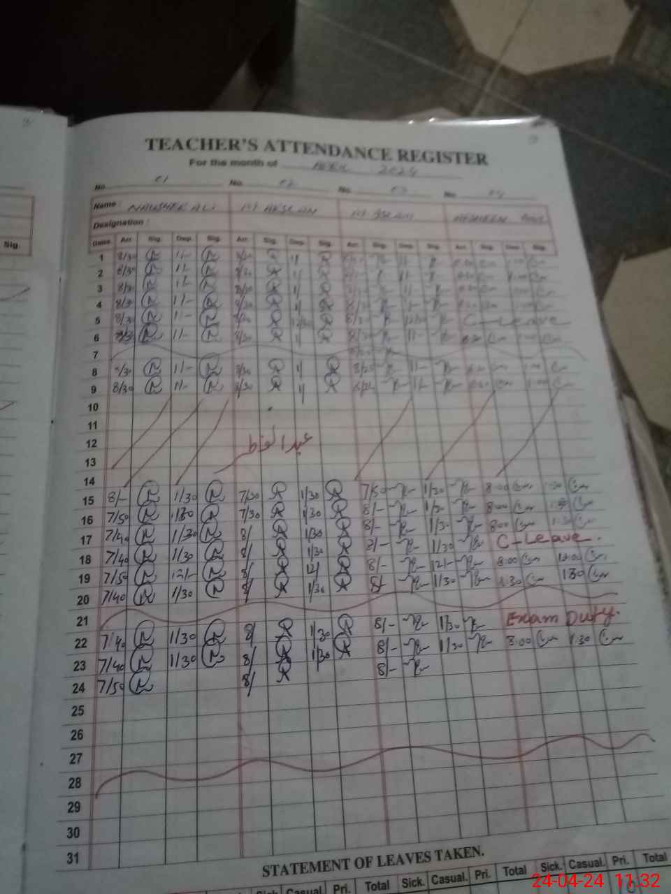 | Leave | Duty | Absent | Maternity | Medical | Ex- Pak |