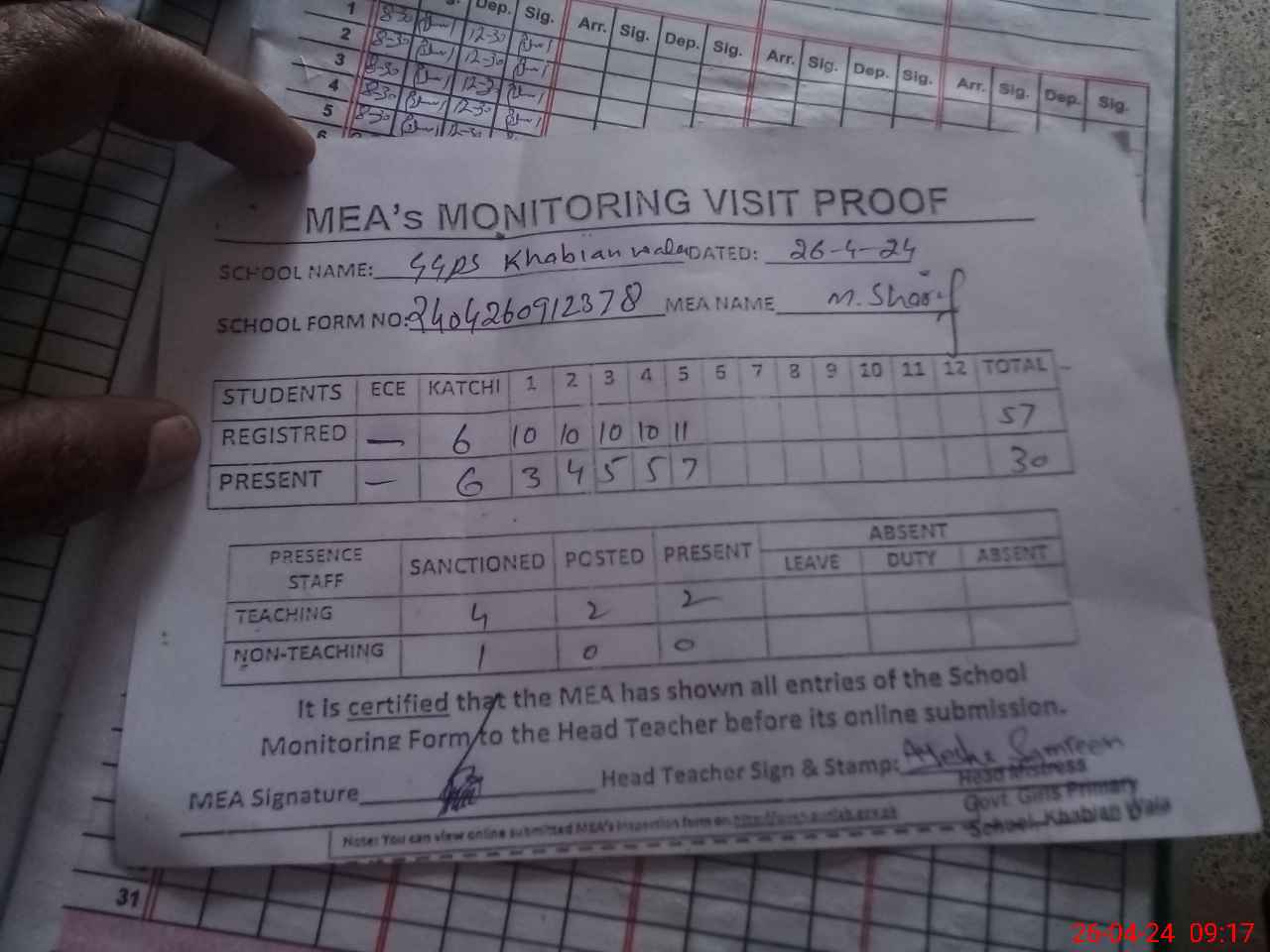 | Attendance Register | Head Teacher | MEA with School | Visit Proof |
