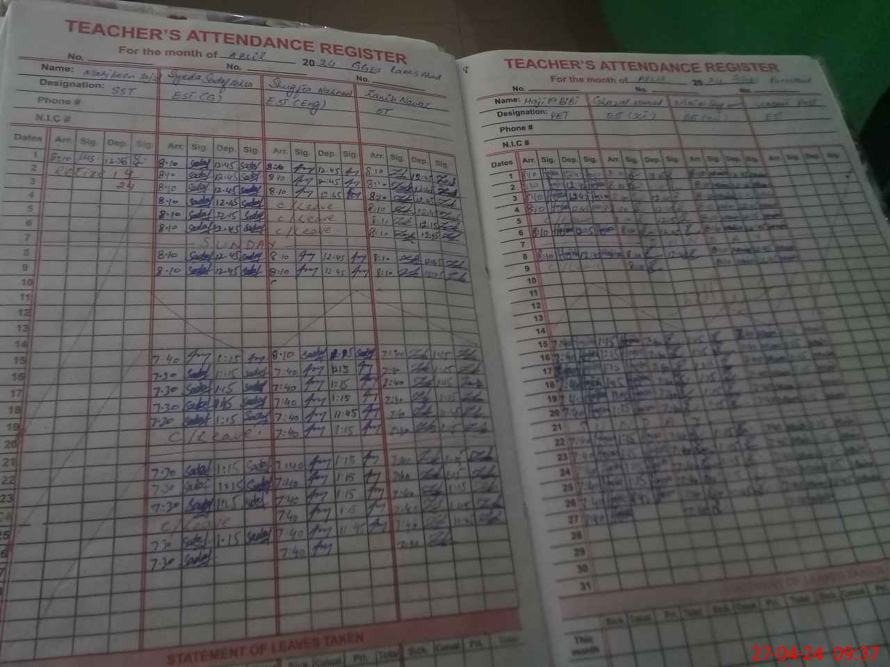 | CNIC | Full Name | Designation | R/C | Absence During Last Calender Month |