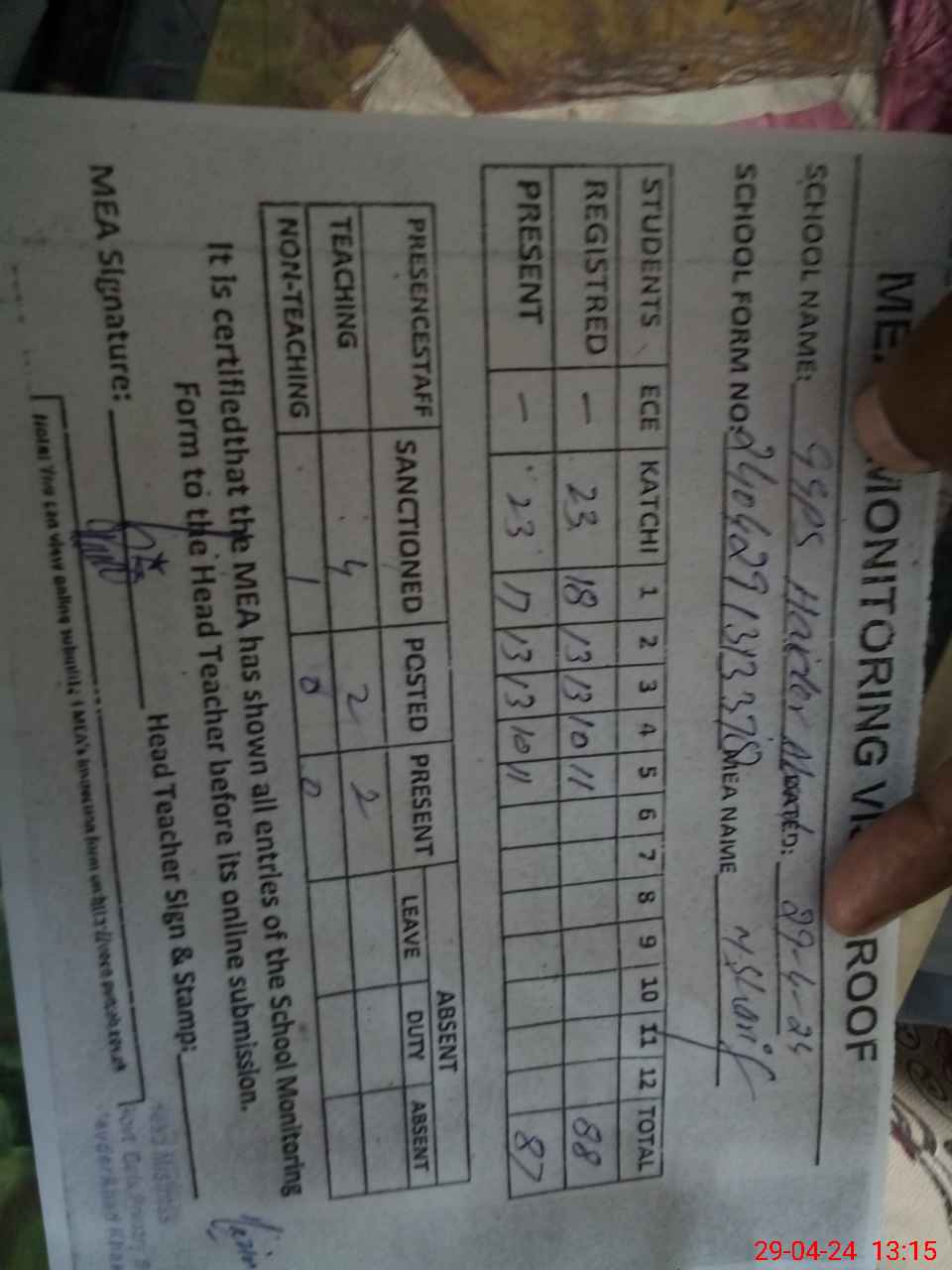 | Attendance Register | Head Teacher | MEA with School | Visit Proof |