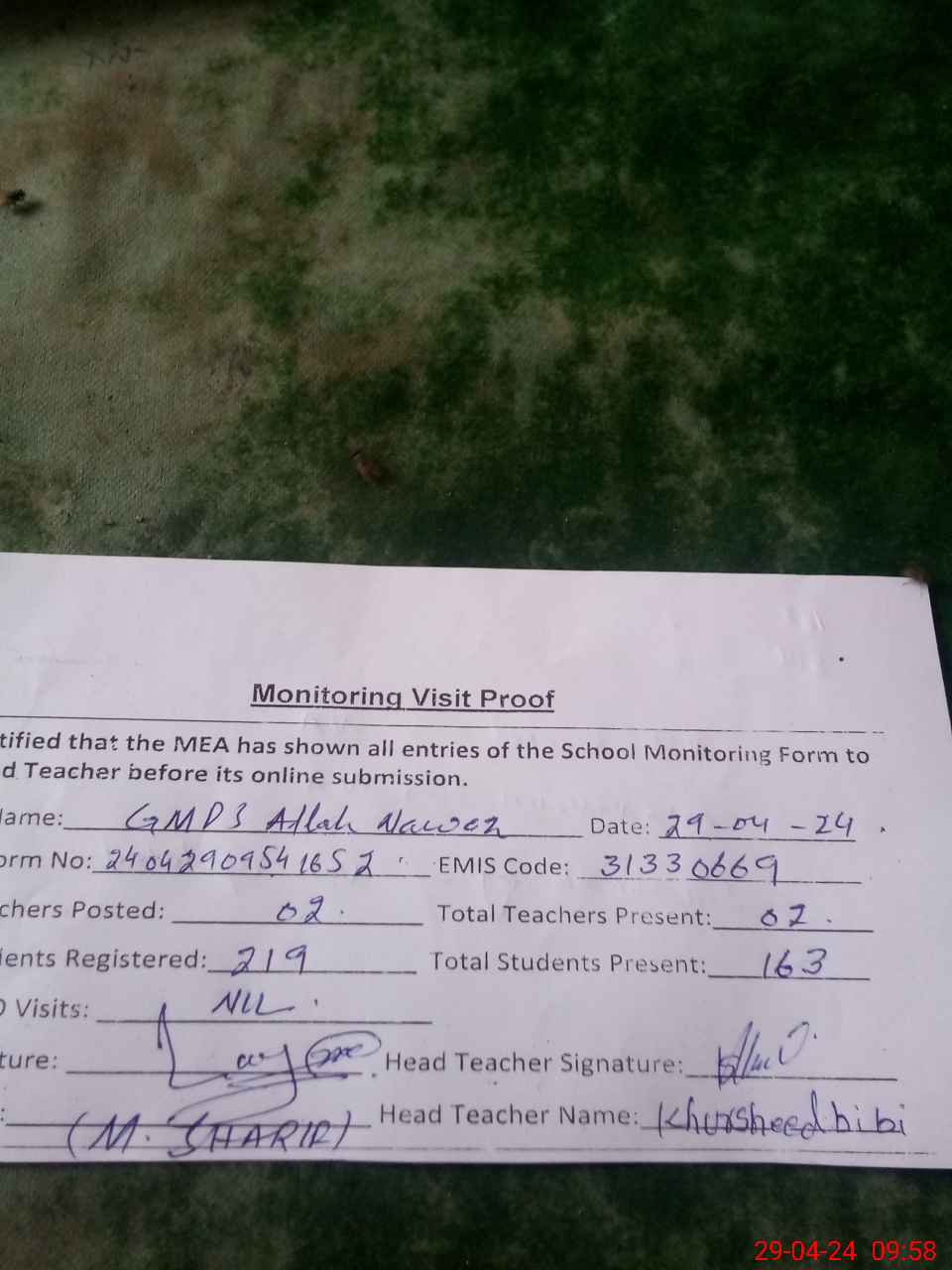 | Attendance Register | Head Teacher | MEA with School | Visit Proof |