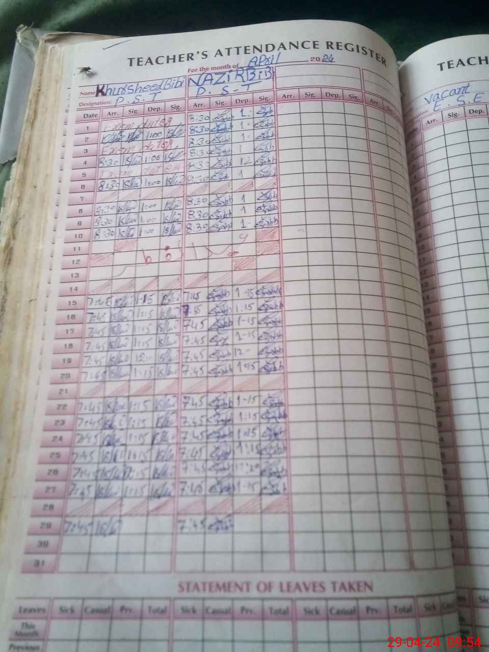 | Leave | Duty | Absent | Maternity | Medical | Ex- Pak |