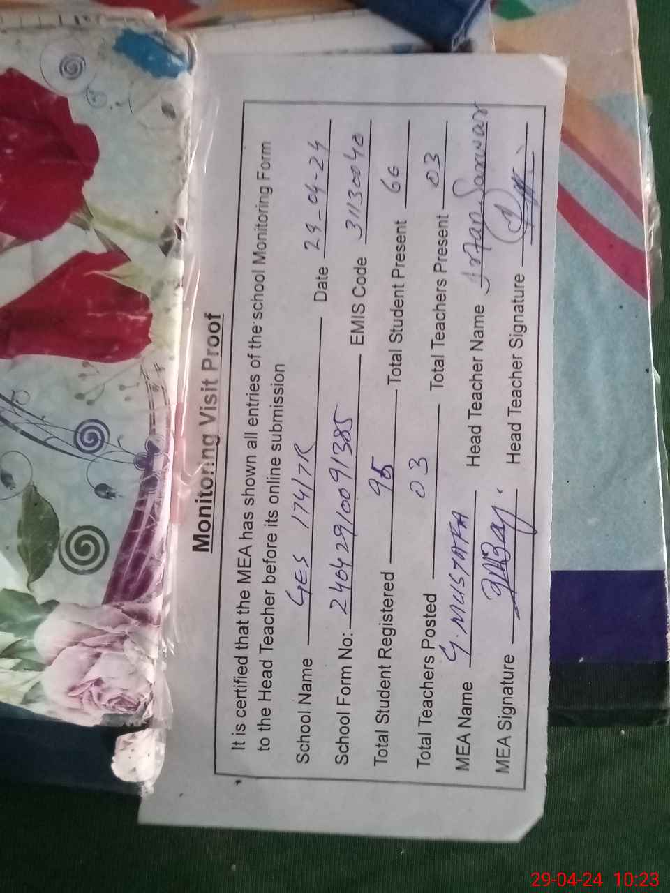 | Attendance Register | Head Teacher | MEA with School | Visit Proof |
