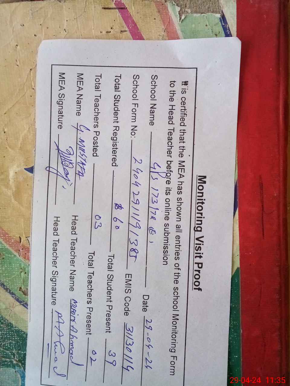 | EMIS Code: 31130114 | Name of School: GPS CHAK NO.173/7-R SHARQI | |||