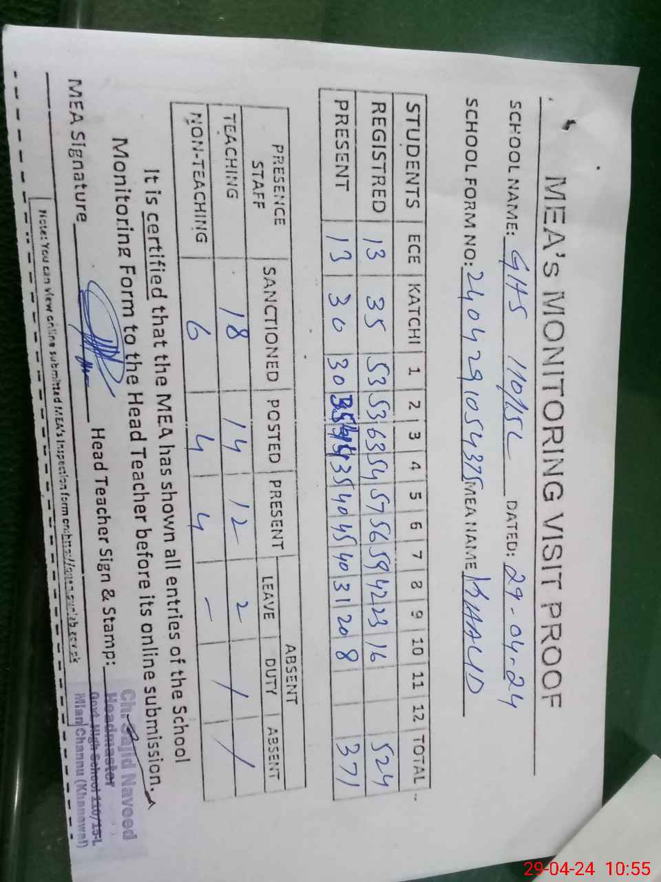 | Attendance Register | Head Teacher | MEA with School | Visit Proof |